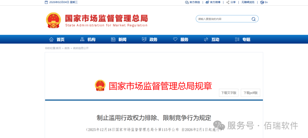 作者: 佰瑞软件 发布时间:2026-02-05 11:20:05制止滥用行政权力排除、限制竞争行为规定 (2025年12月18日国家市场监督管理总局令第115号公布 自2026年2月1日起施行)
